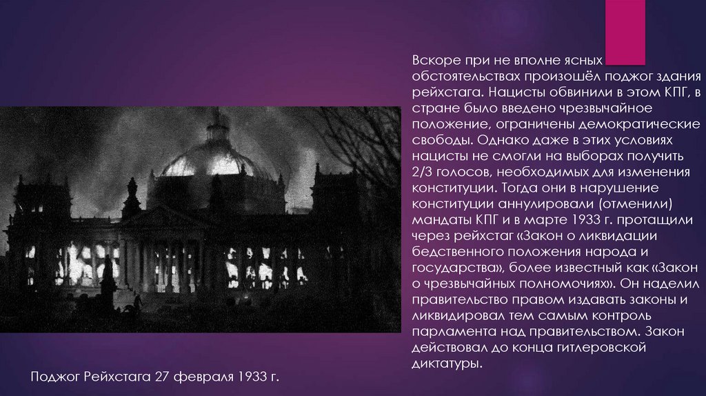 Поджог Рейхстага 27 февраля 1933 г.Вскоре при не вполне ясных