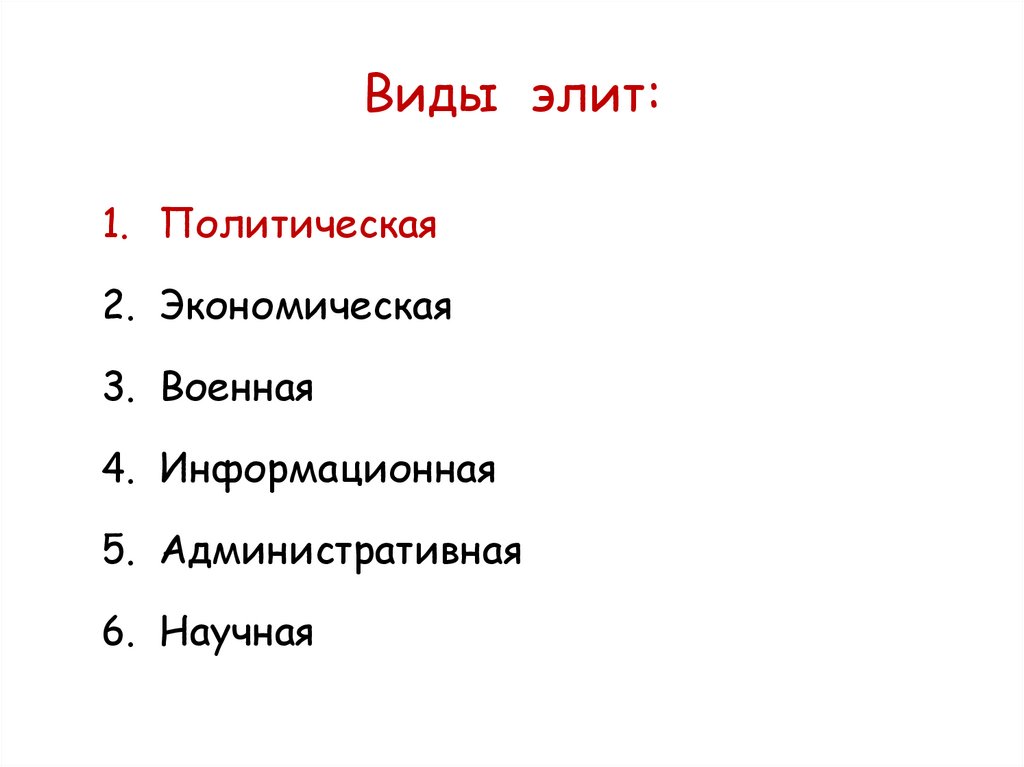 Виды элит:1. Политическая