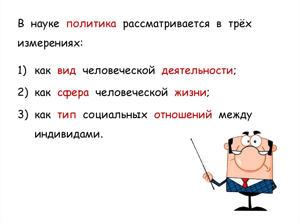 В науке политика рассматривается в трёхизмерениях:
