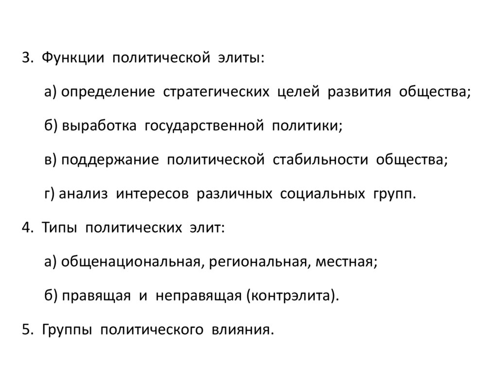 3. Функции политической элиты:а) определение стратегических целей развития общества;