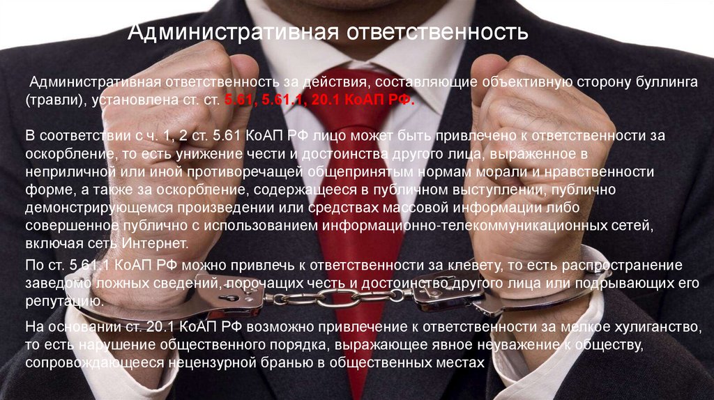 Административная ответственностьАдминистративная ответственность за действия, составляющие объективную сторону буллинга