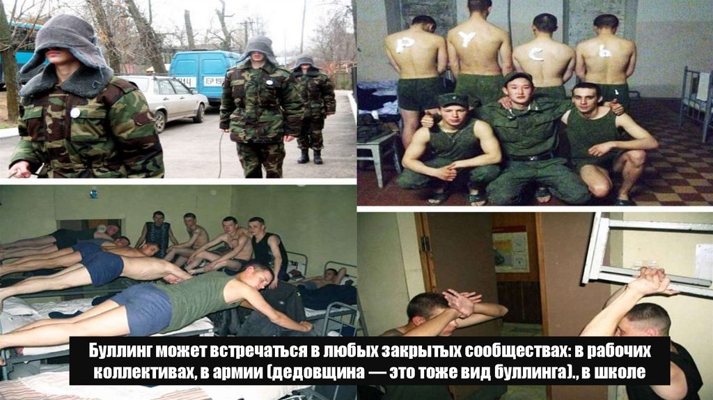 Буллинг может встречаться в любых закрытых сообществах: в рабочихколлективах, в армии (дедовщина — это тоже вид буллинга)., в школе