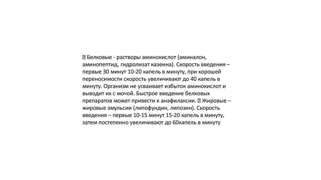 Белковые - растворы аминокислот (аминалон,аминопептид, гидролизат казеина). Скорость введения –