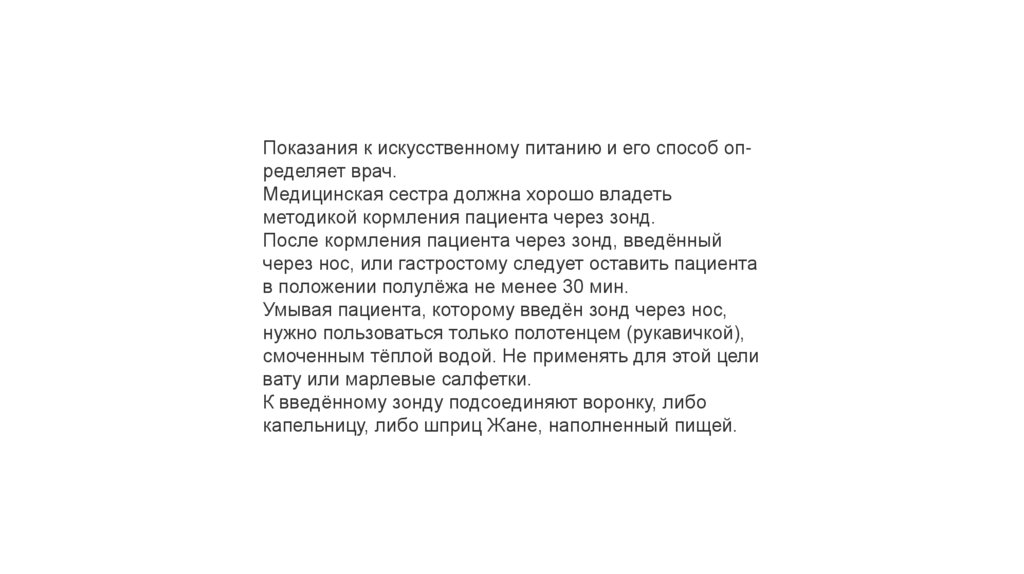 Показания к искусственному питанию и его способ определяет врач.Медицинская сестра должна хорошо владеть