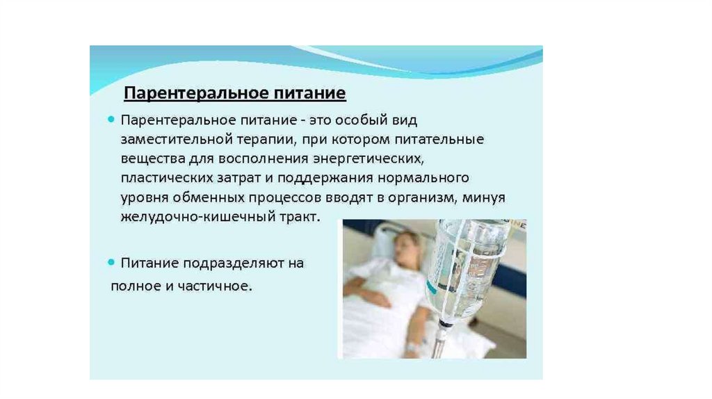 Парентеральное питание (ПН) - это введениечеловеку питательных продуктов внутривенно в