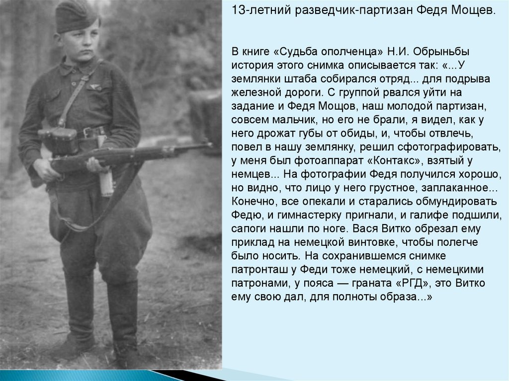 13-летний разведчик-партизан Федя Мощев.В книге «Судьба ополченца» Н.И. Обрыньбы