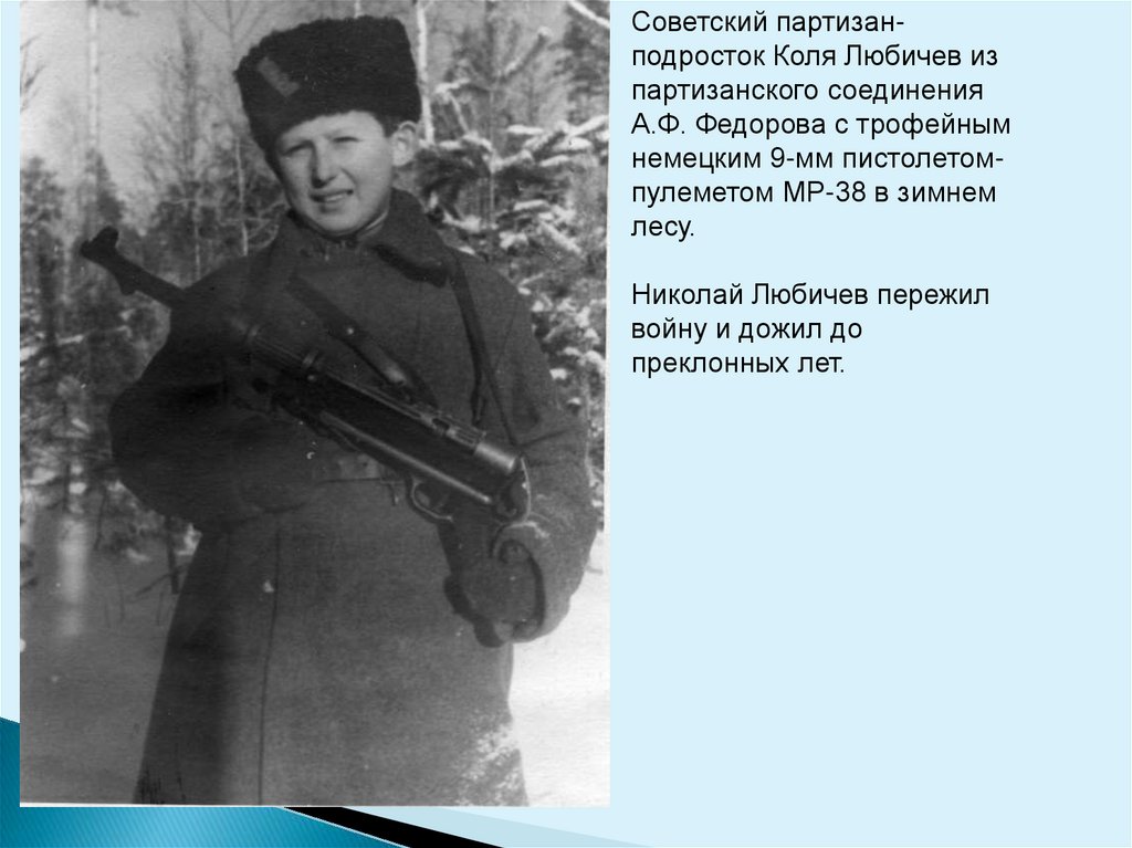 Советский партизанподросток Коля Любичев изпартизанского соединения