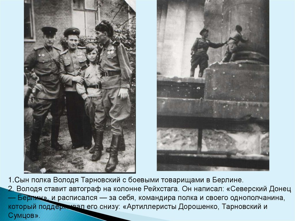 1.Cын полка Володя Тарновский с боевыми товарищами в Берлине.2. Володя ставит автограф на колонне Рейхстага. Он написал: «Северский Донец