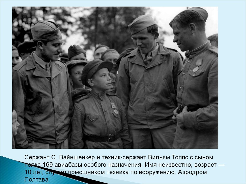Сержант С. Вайншенкер и техник-сержант Вильям Топпс с сыномполка 169 авиабазы особого назначения. Имя неизвестно, возраст —