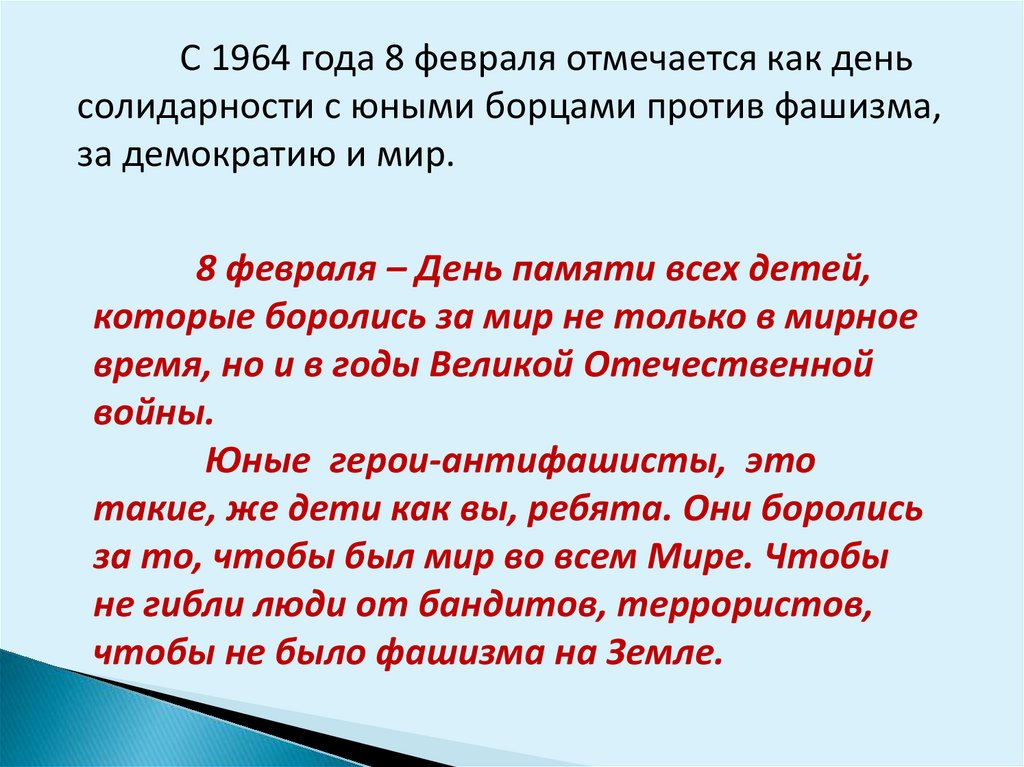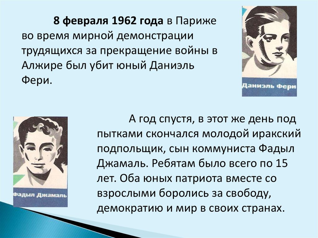 С 1964 года 8 февраля отмечается как деньсолидарности с юными борцами против фашизма,