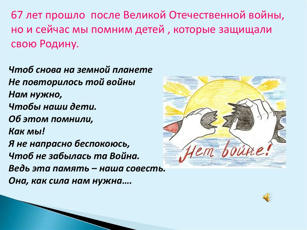 67 лет прошло после Великой Отечественной войны,но и сейчас мы помним детей , которые защищали