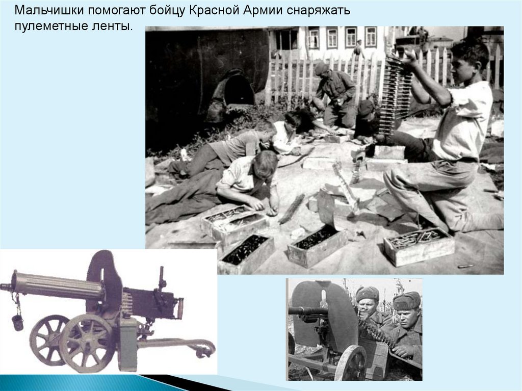 Мальчишки помогают бойцу Красной Армии снаряжатьпулеметные ленты.