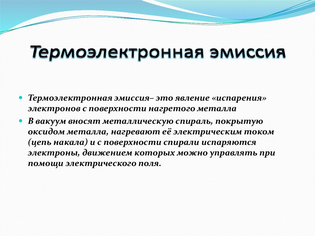 Термоэлектронная эмиссия– это явление «испарения»электронов с поверхности нагретого металла