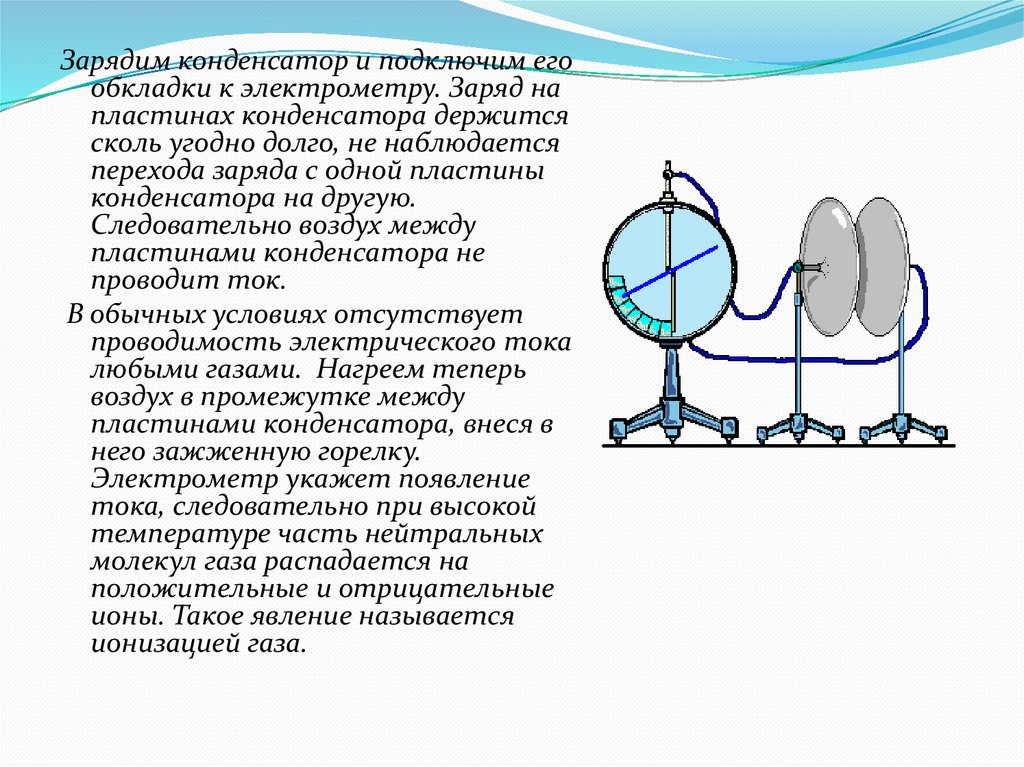 Зарядим конденсатор и подключим егообкладки к электрометру. Заряд на