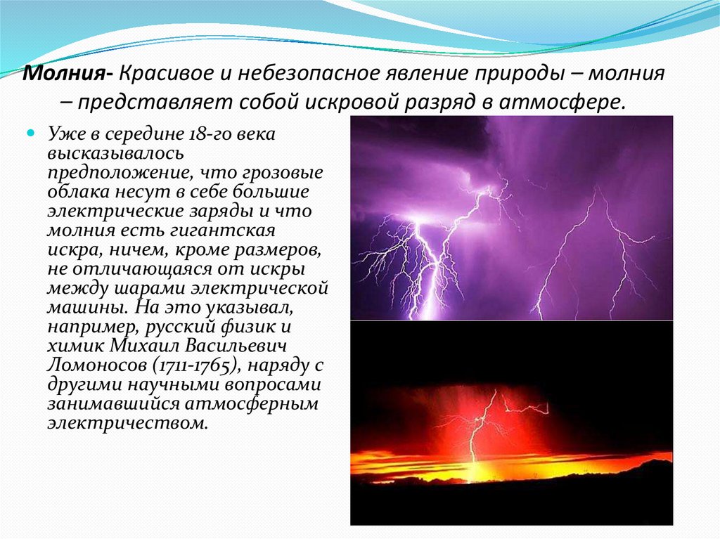 Молния- Красивое и небезопасное явление природы – молния– представляет собой искровой разряд в атмосфере.