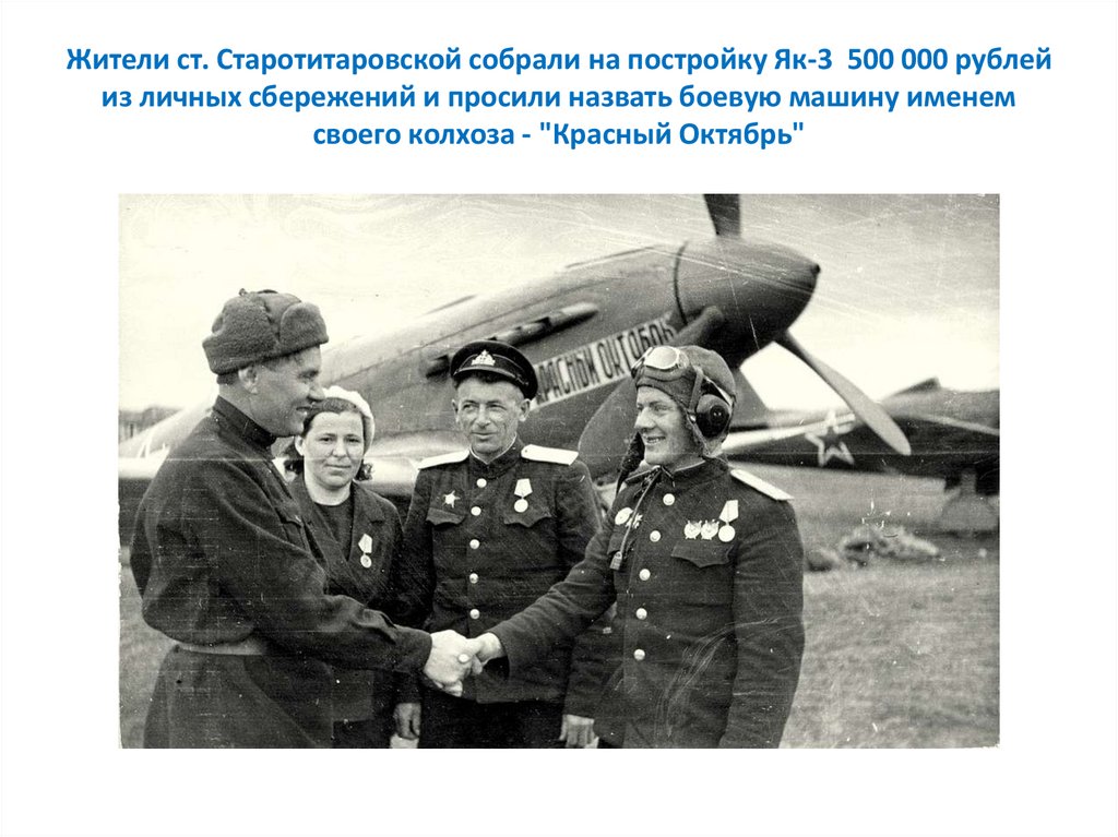 Жители ст. Старотитаровской собрали на постройку Як-3 500 000 рублейиз личных сбережений и просили назвать боевую машину именем