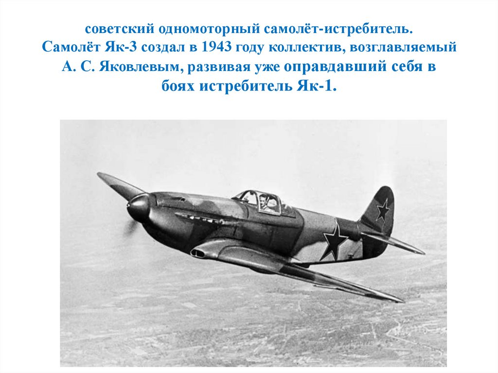 советский одномоторный самолёт-истребитель.Самолёт Як-3 создал в 1943 году коллектив, возглавляемый