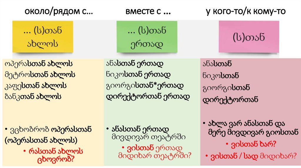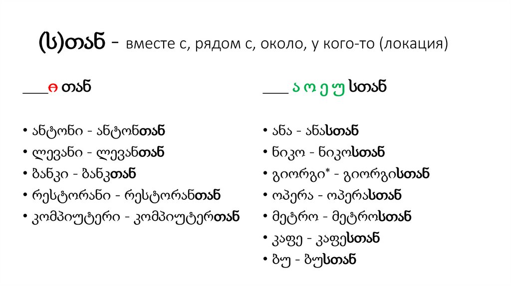 (ს)თან - вместе с, рядом с, около, у кого-то (локация)___ი თან