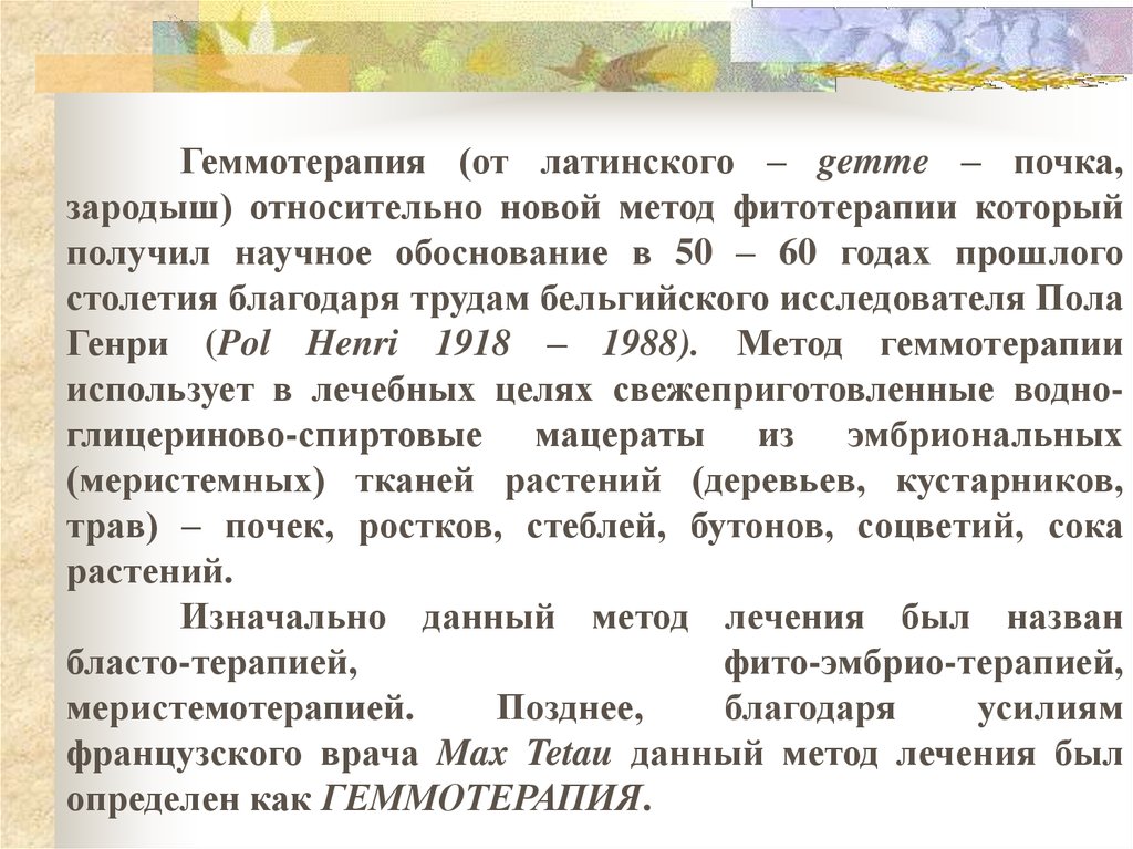 Геммотерапия (от латинского – gemme – почка,зародыш) относительно новой метод фитотерапии который
