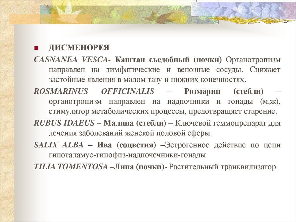 ДИСМЕНОРЕЯCASNANEA VESCA- Каштан съедобный (почки) Органотропизм