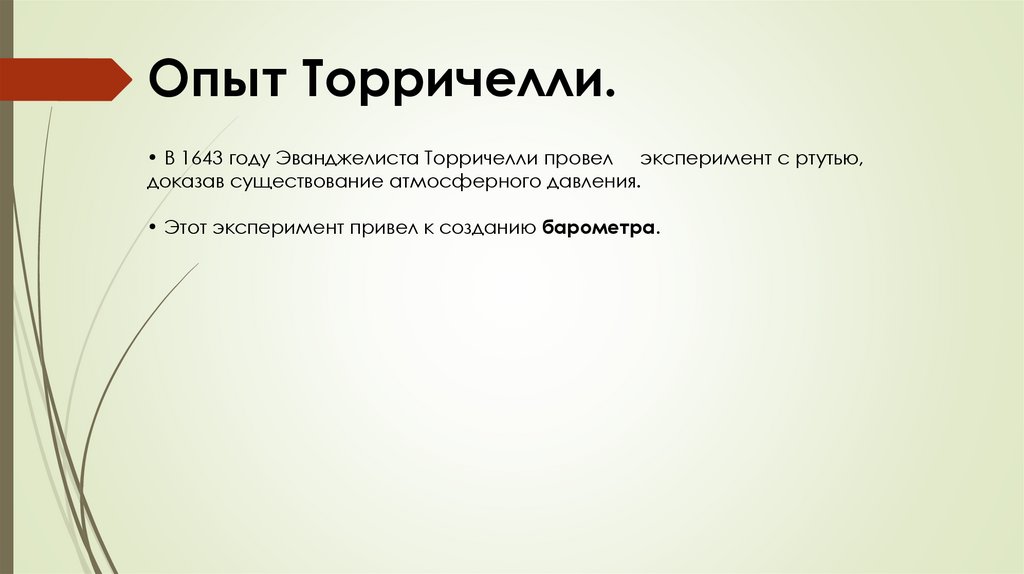 Опыт Торричелли.• В 1643 году Эванджелиста Торричелли провел эксперимент с ртутью,