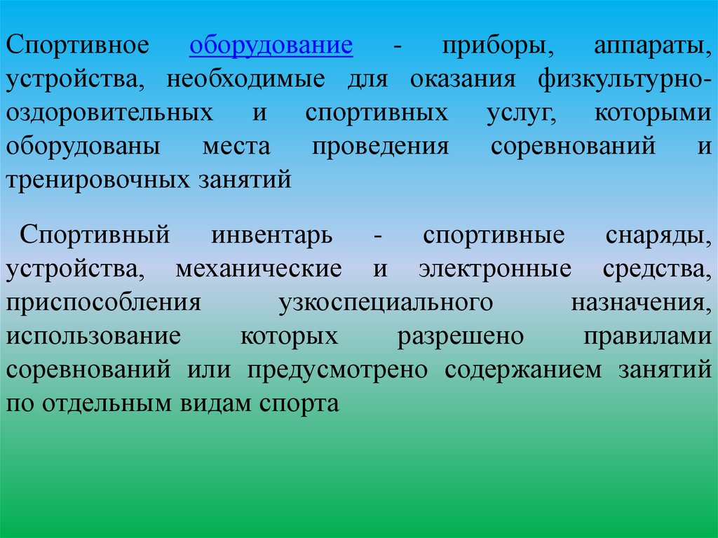 2. Спортивное оборудование - приборы, аппараты, устройства, необходимые для оказания физкультурно-оздоровительных и спортивных