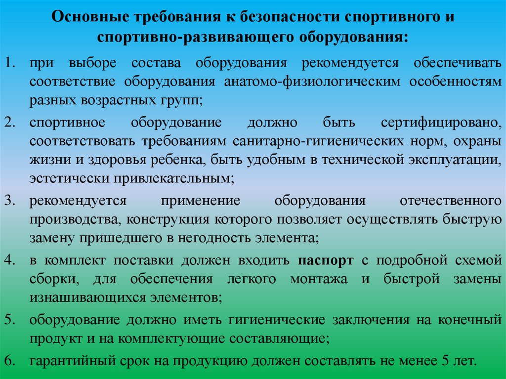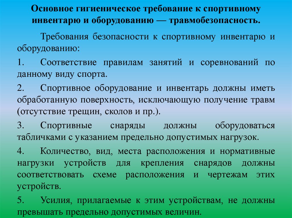 5. Основное гигиеническое требование к спортивному инвентарю и оборудованию — травмобезопасность.