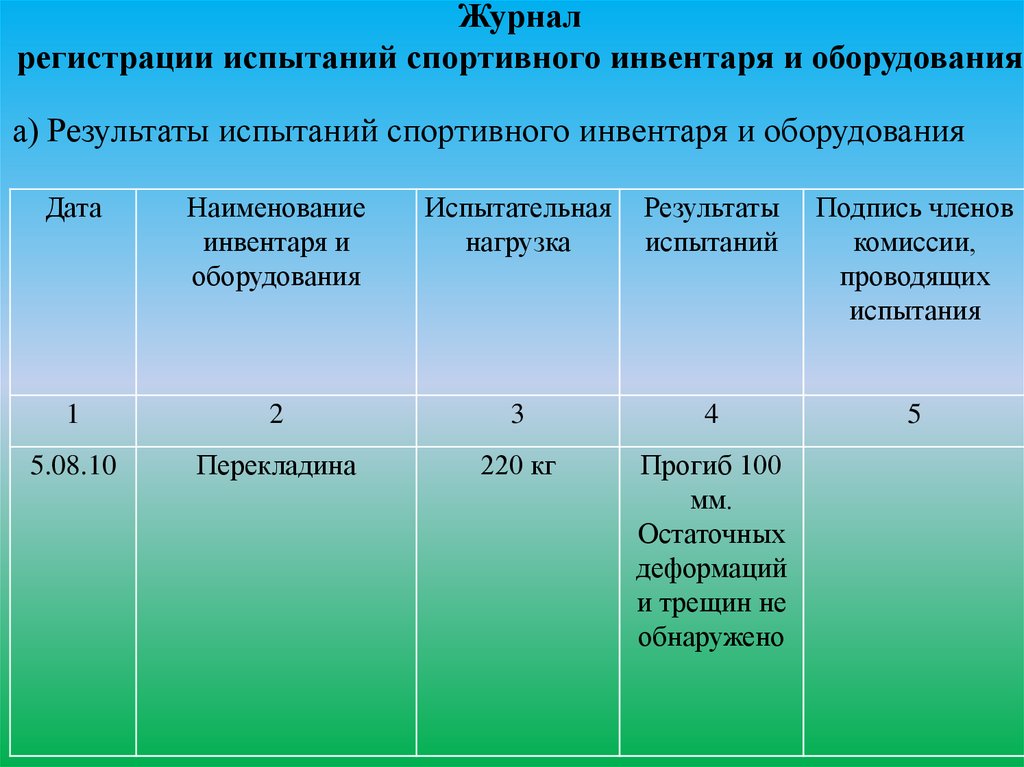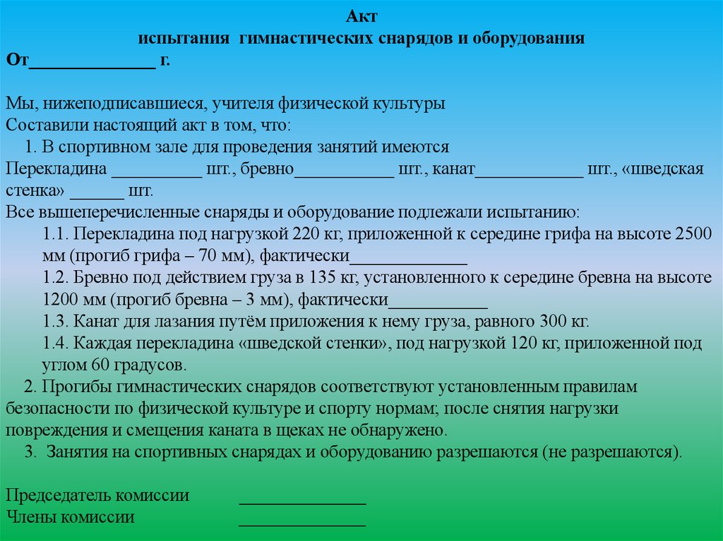 5. Наличие актов испытания гимнастических снарядов, спортивного