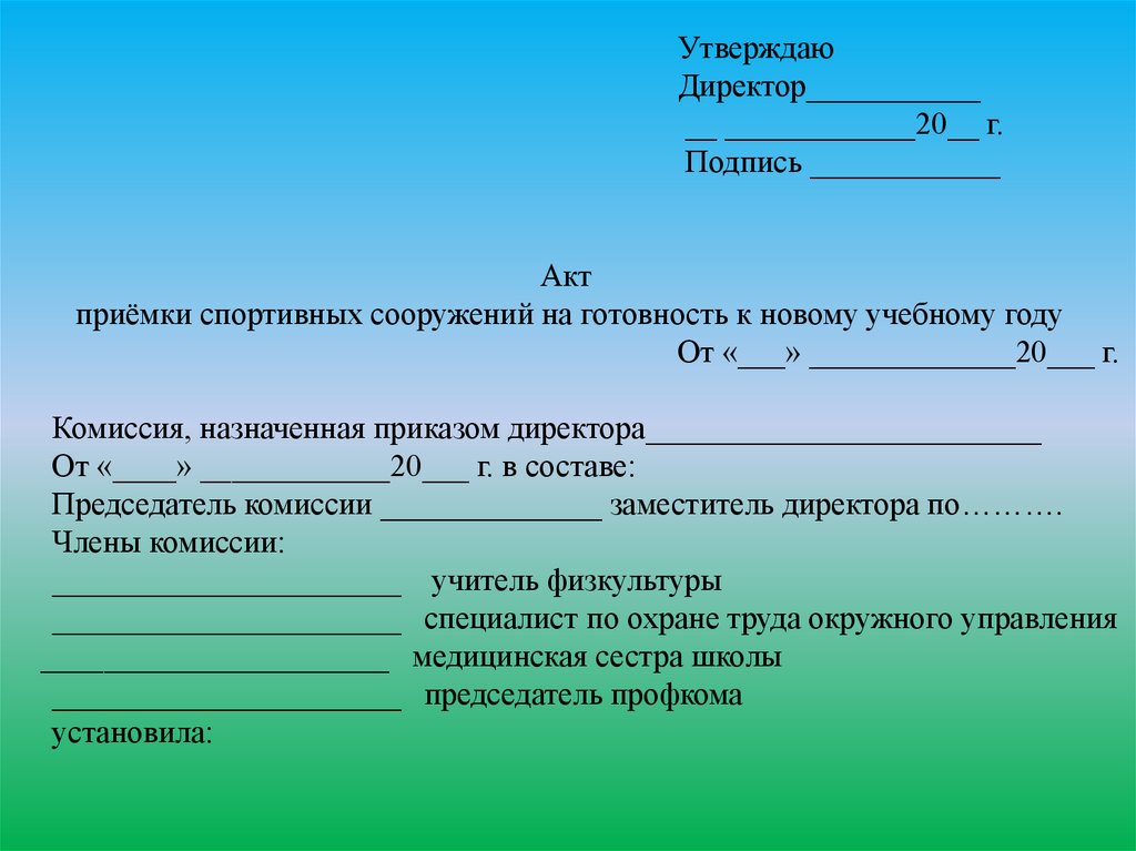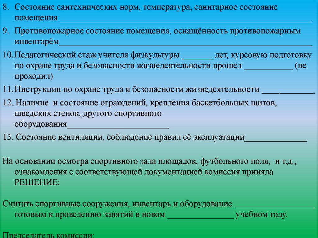 На основании осмотра спортивного зала площадок, футбольного поля, и т.д.,