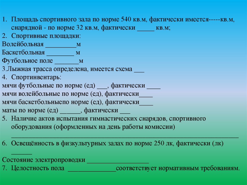 1. Площадь спортивного зала по норме 540 кв.м, фактически имеется-----кв.м,снарядной - по норме 32 кв.м, фактически _____ кв.м;