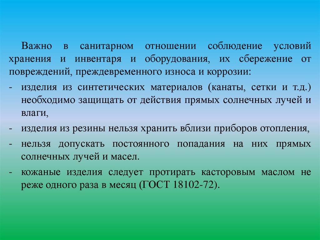 Важно в санитарном отношении соблюдение условийхранения и инвентаря и оборудования, их сбережение от