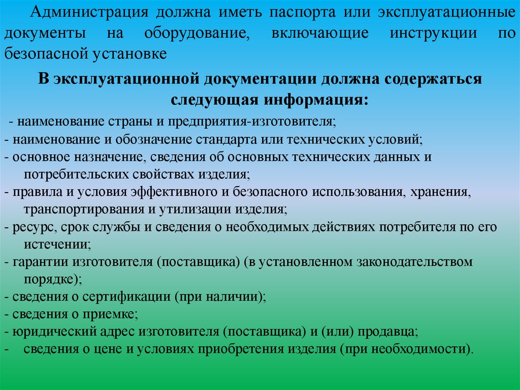 Администрация должна иметь паспорта или эксплуатационныедокументы на оборудование, включающие инструкции по