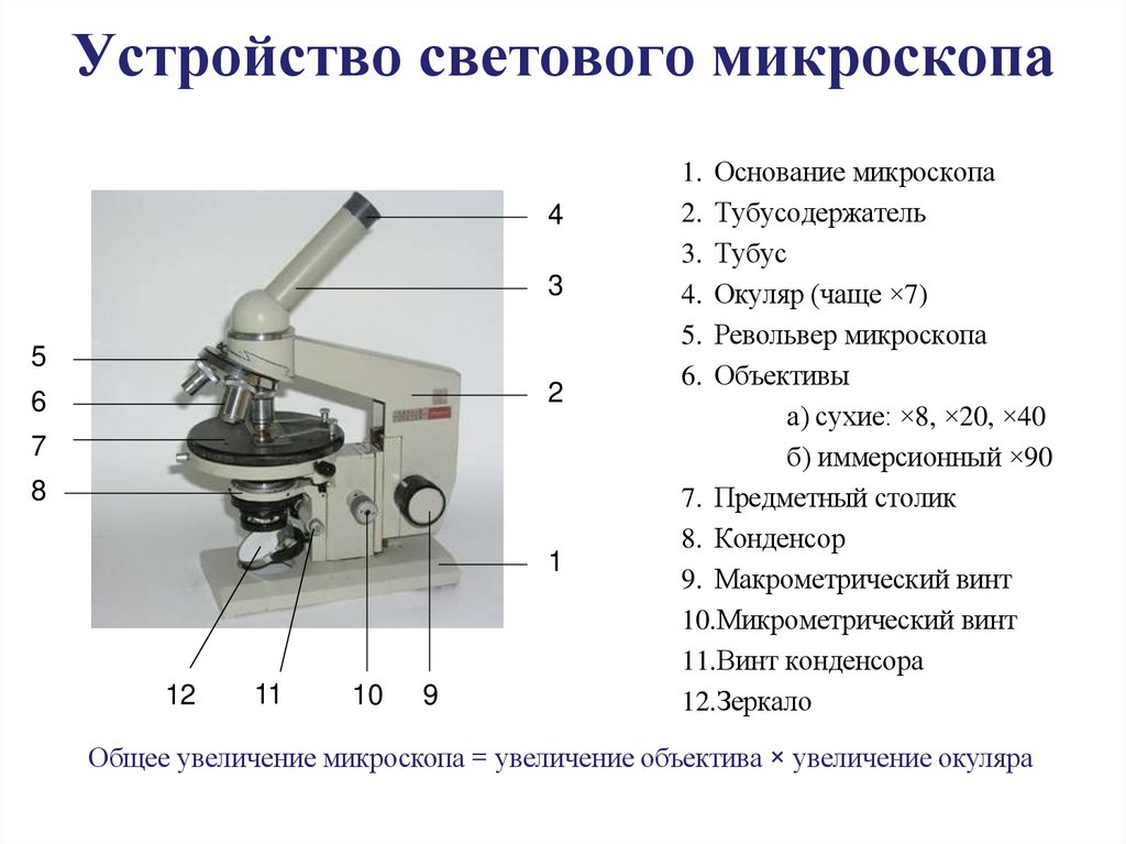 Общее увеличение микроскопа = увеличение объектива × увеличение окуляра