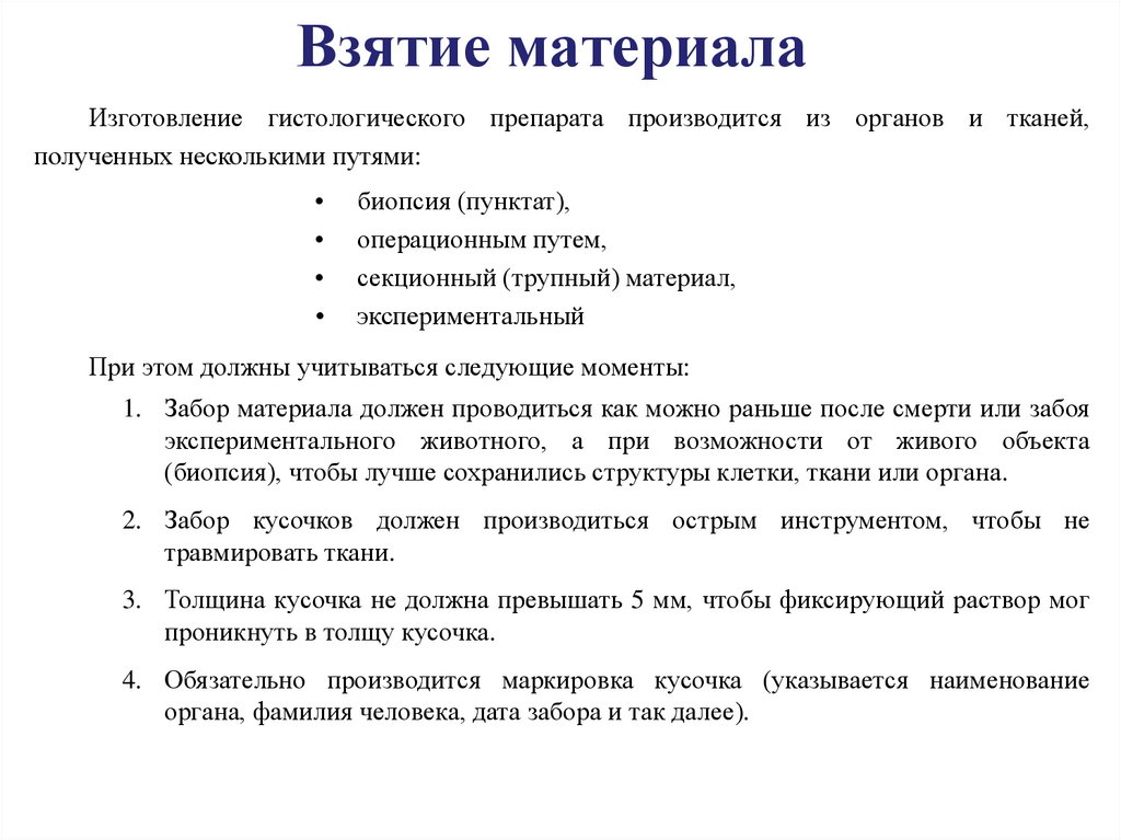 Изготовление гистологического препарата производится из органов и тканей,полученных несколькими путями: