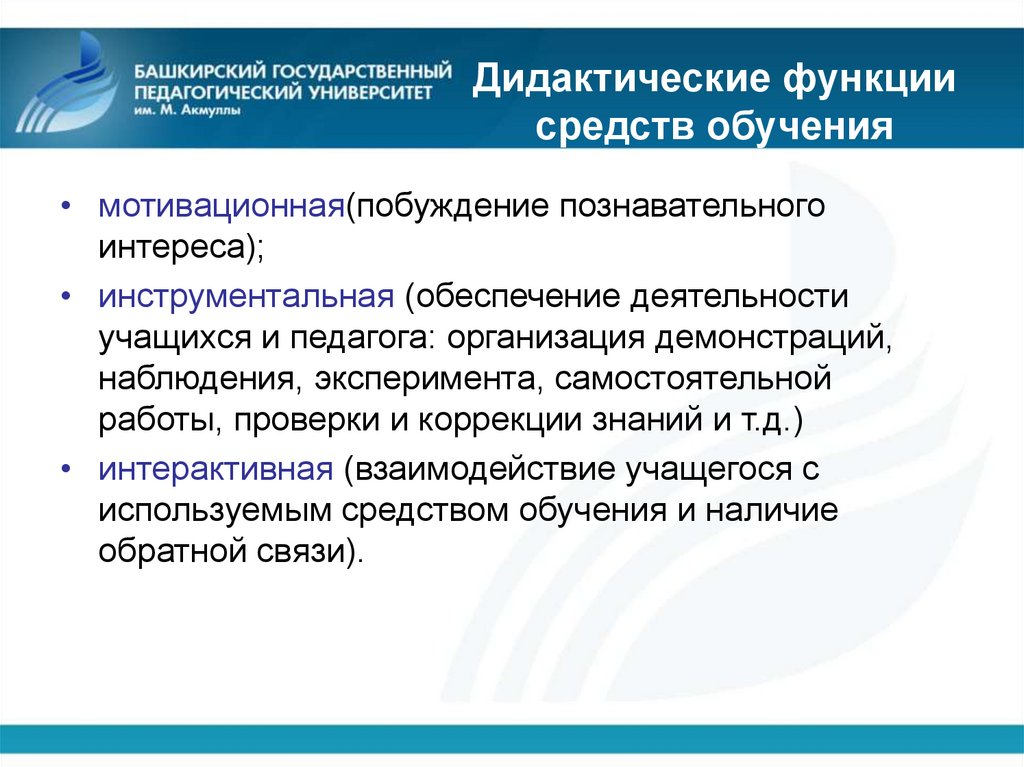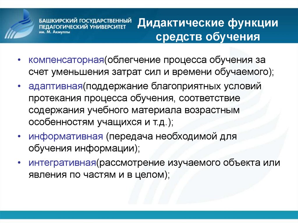 • компенсаторная(облегчение процесса обучения засчет уменьшения затрат сил и времени обучаемого);