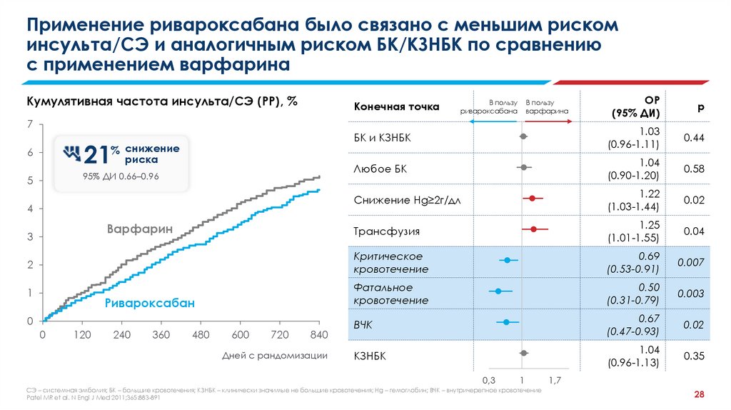 Применение ривароксабана было связано с меньшим рискоминсульта/СЭ и аналогичным риском БК/КЗНБК по сравнению
