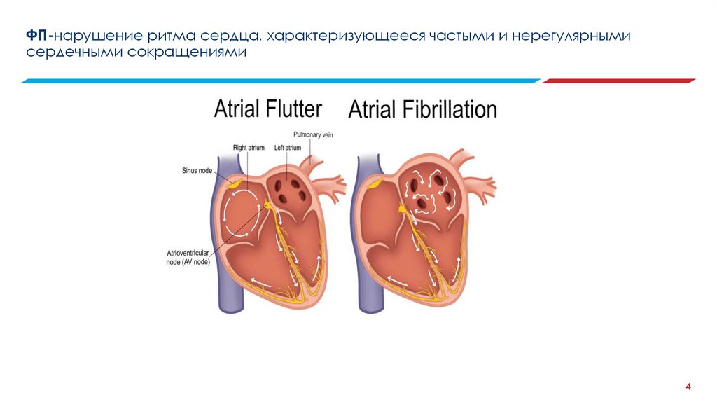 ФП-нарушение ритма сердца, характеризующееся частыми и нерегулярнымисердечными сокращениями