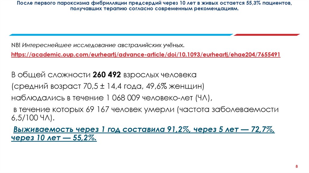 После первого пароксизма фибрилляции предсердий через 10 лет в живых остается 55,3% пациентов,получавших терапию согласно современным рекомендациям.