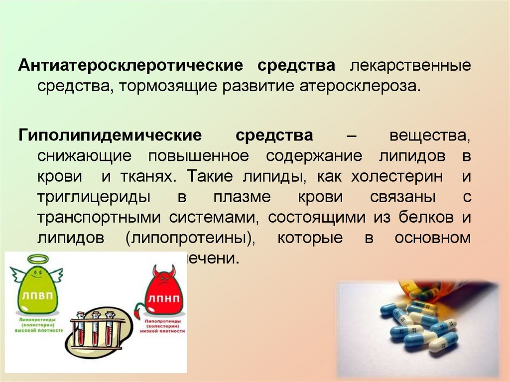Антиатеросклеротические средства лекарственныесредства, тормозящие развитие атеросклероза.