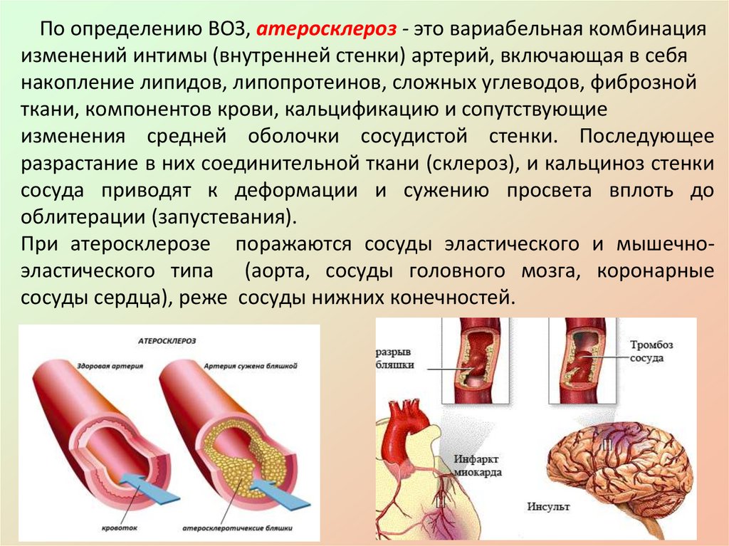 По определению ВОЗ, атеросклероз - это вариабельная комбинацияизменений интимы (внутренней стенки) артерий, включающая в себя