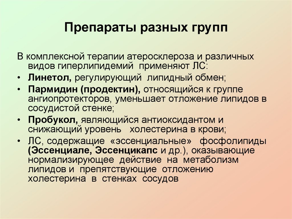Препараты разных группВ комплексной терапии атеросклероза и различных