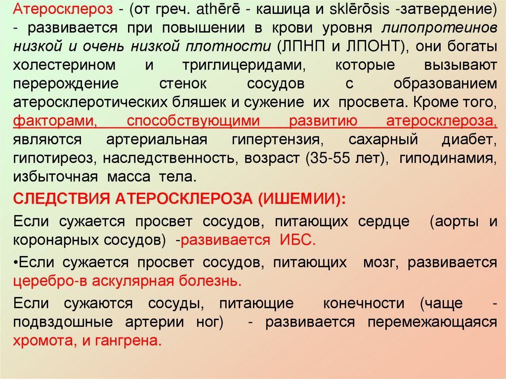 Атеросклероз - (от греч. athērē - кашица и sklērōsis -затвердение)- развивается при повышении в крови уровня липопротеинов