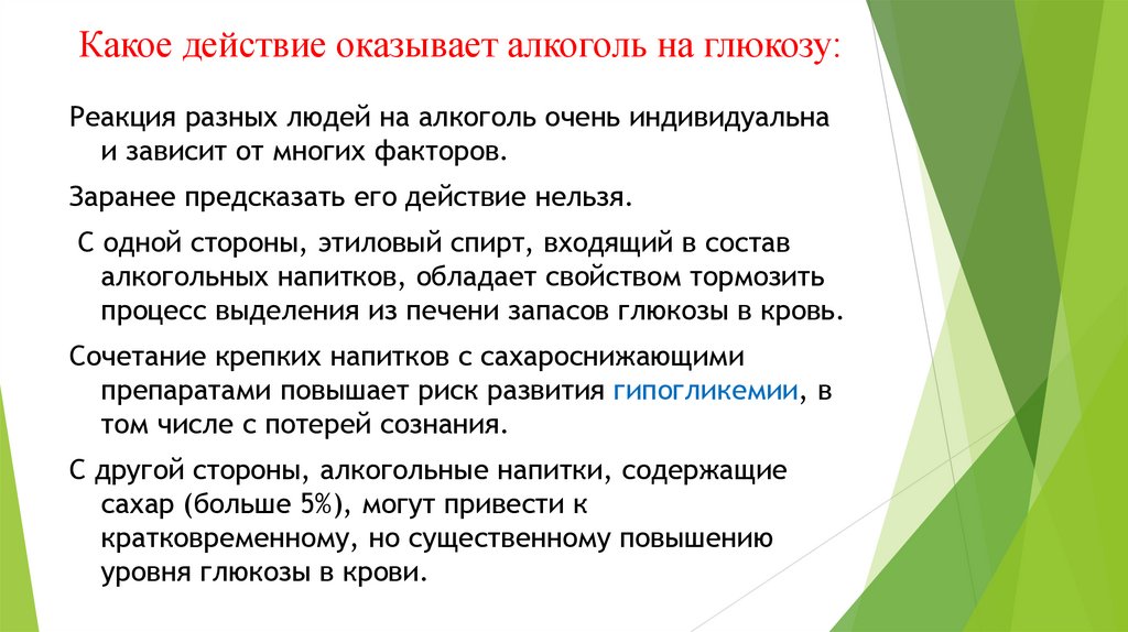 Какое действие оказывает алкоголь на глюкозу:Реакция разных людей на алкоголь очень индивидуальна