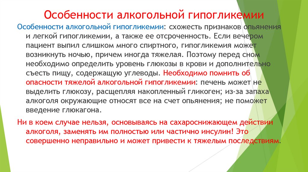 и легкой гипогликемии, а также ее отсроченность. Если вечером