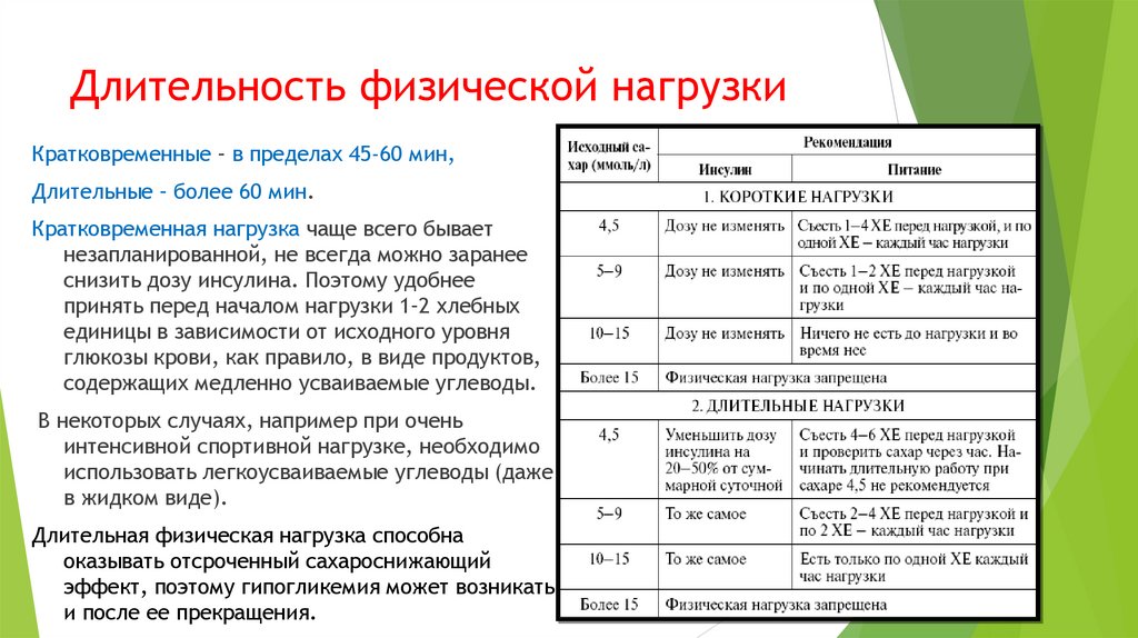 Длительность физической нагрузкиКратковременные – в пределах 45-60 мин,