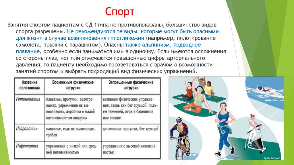СпортЗанятия спортом пациентам с СД 1типа не противопоказаны, большинство видов