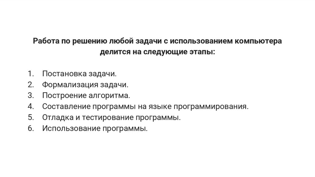 Работа по решению любой задачи с использованием компьютераделится на следующие этапы: