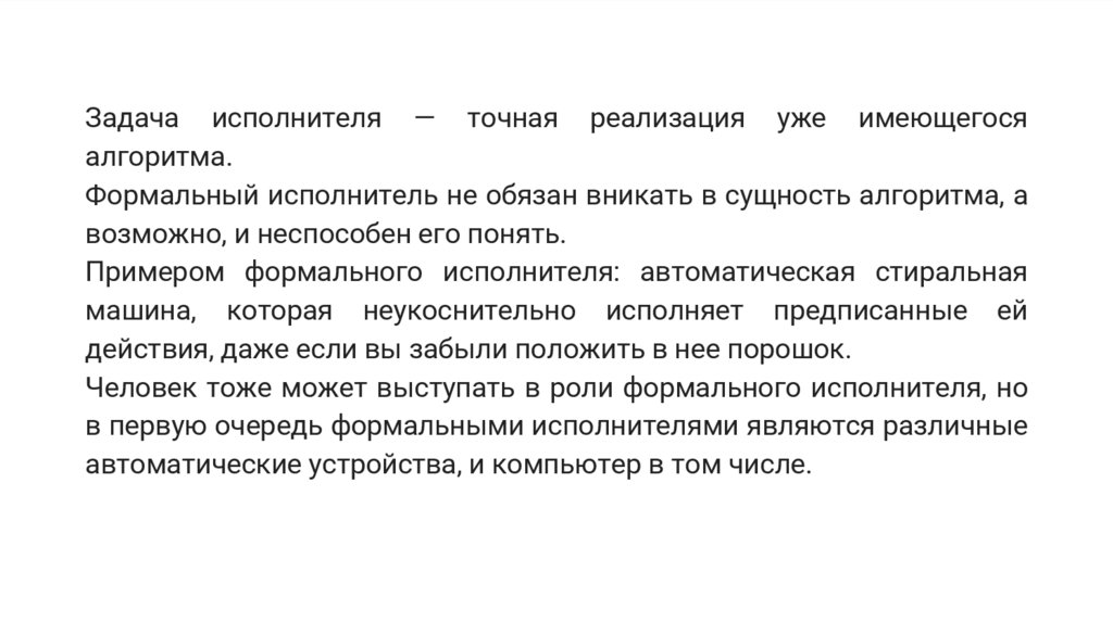 Формальный исполнитель не обязан вникать в сущность алгоритма, а