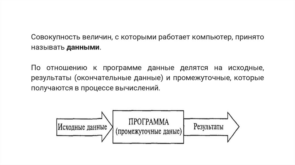 Совокупность величин, с которыми работает компьютер, принятоназывать данными.
