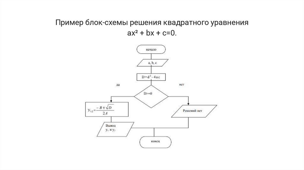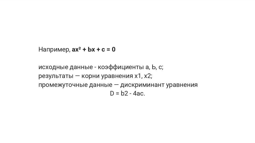 Например, ах² + Ьх + с = 0исходные данные - коэффициенты а, Ь, с;